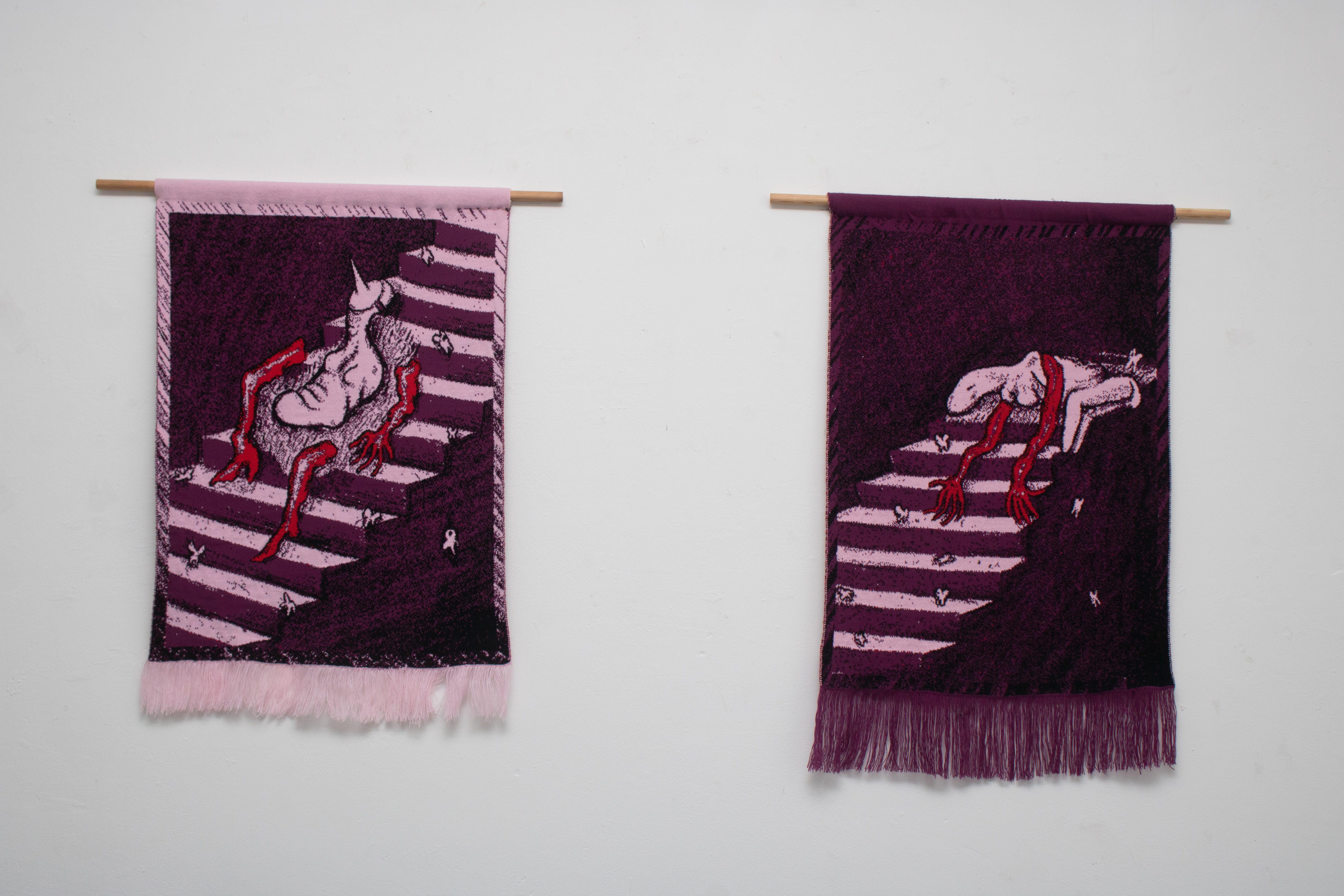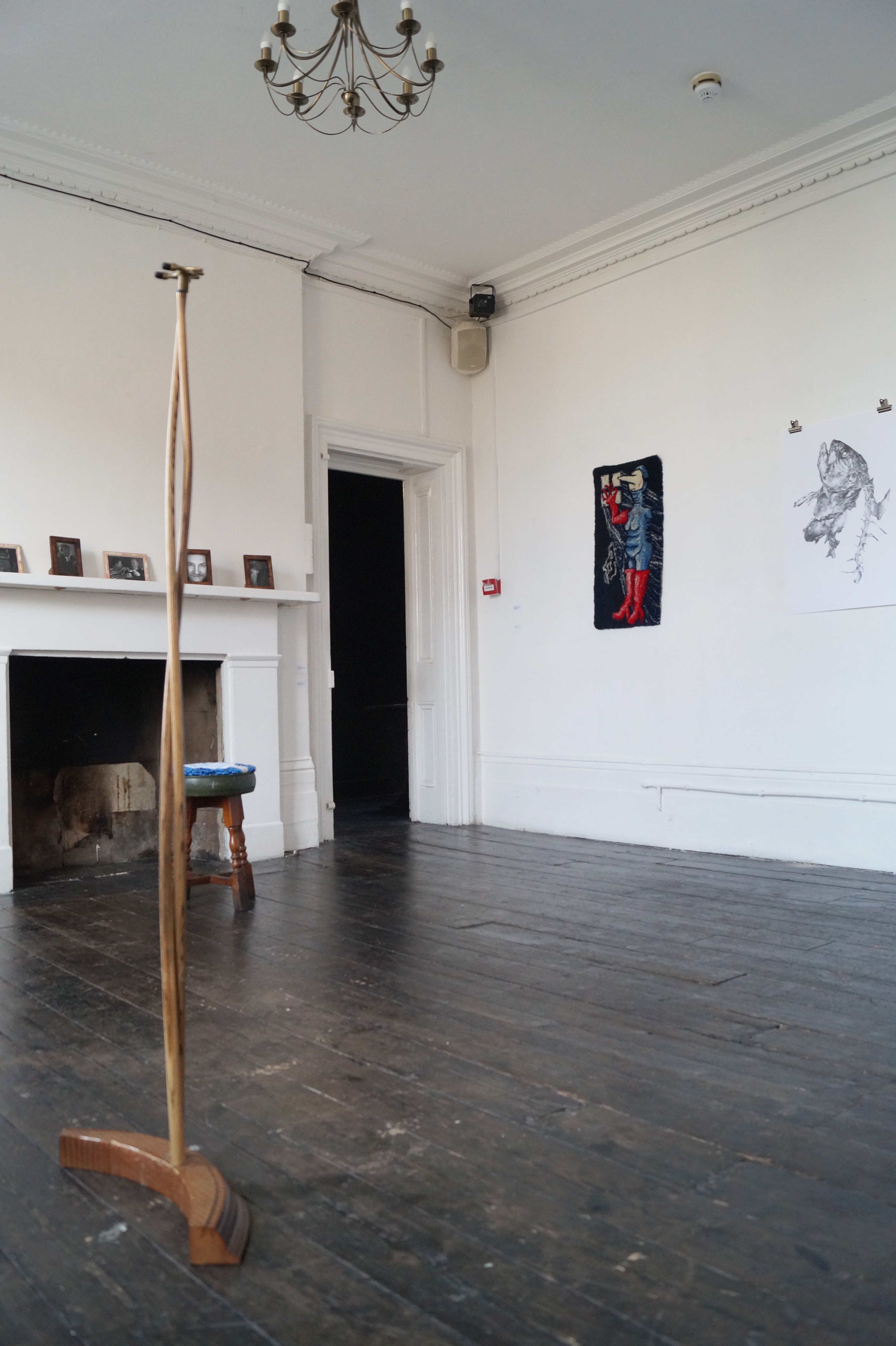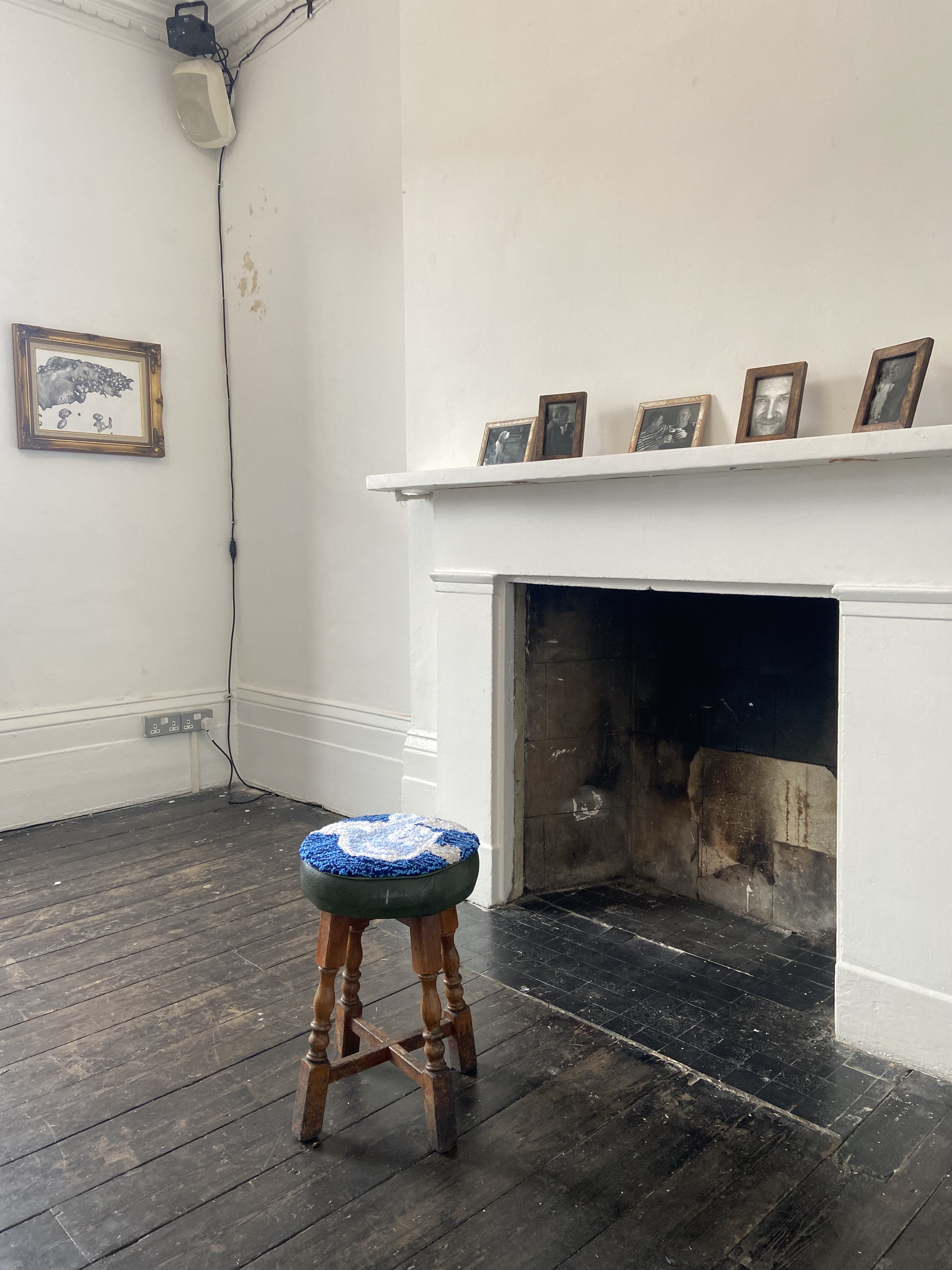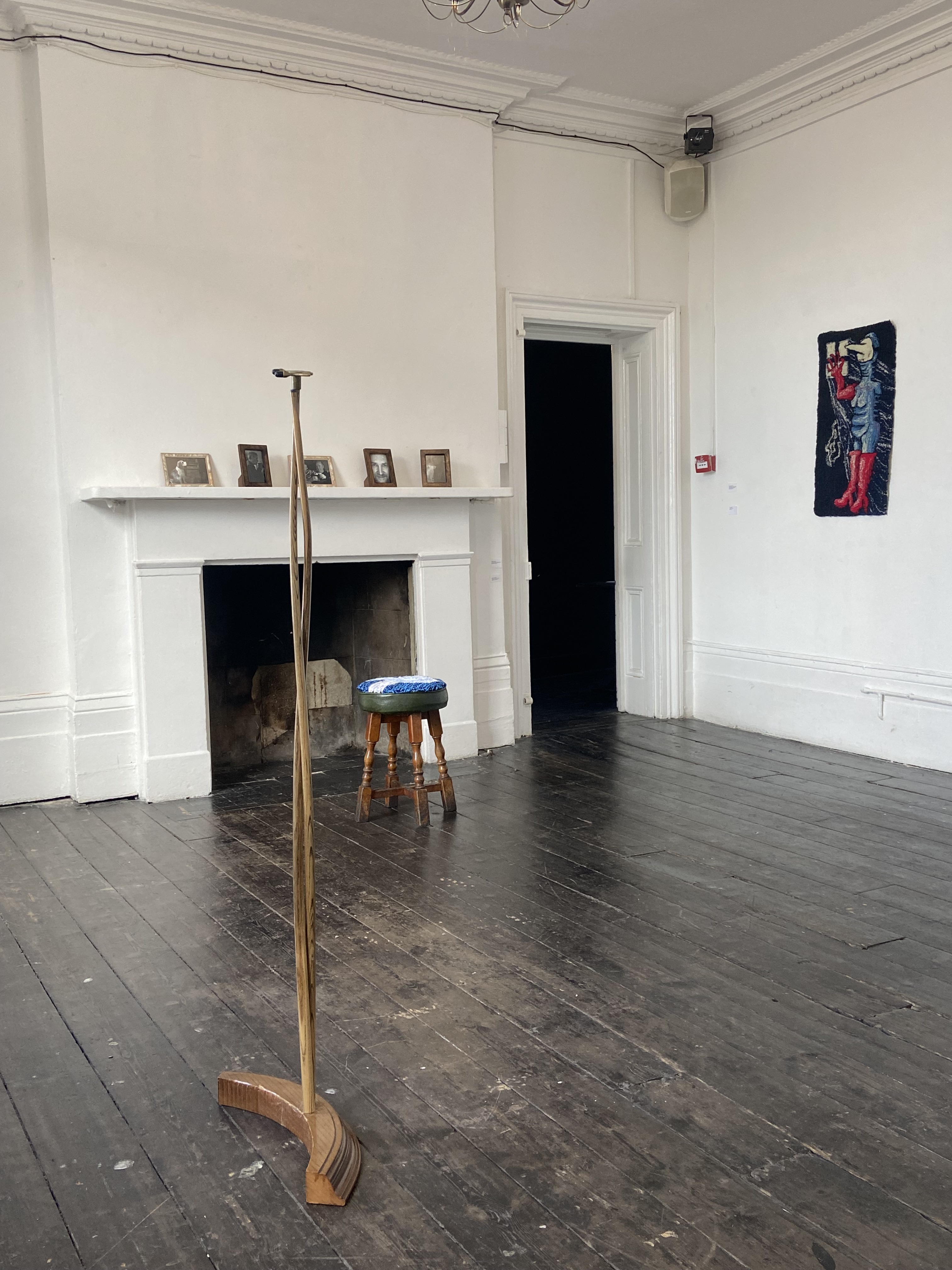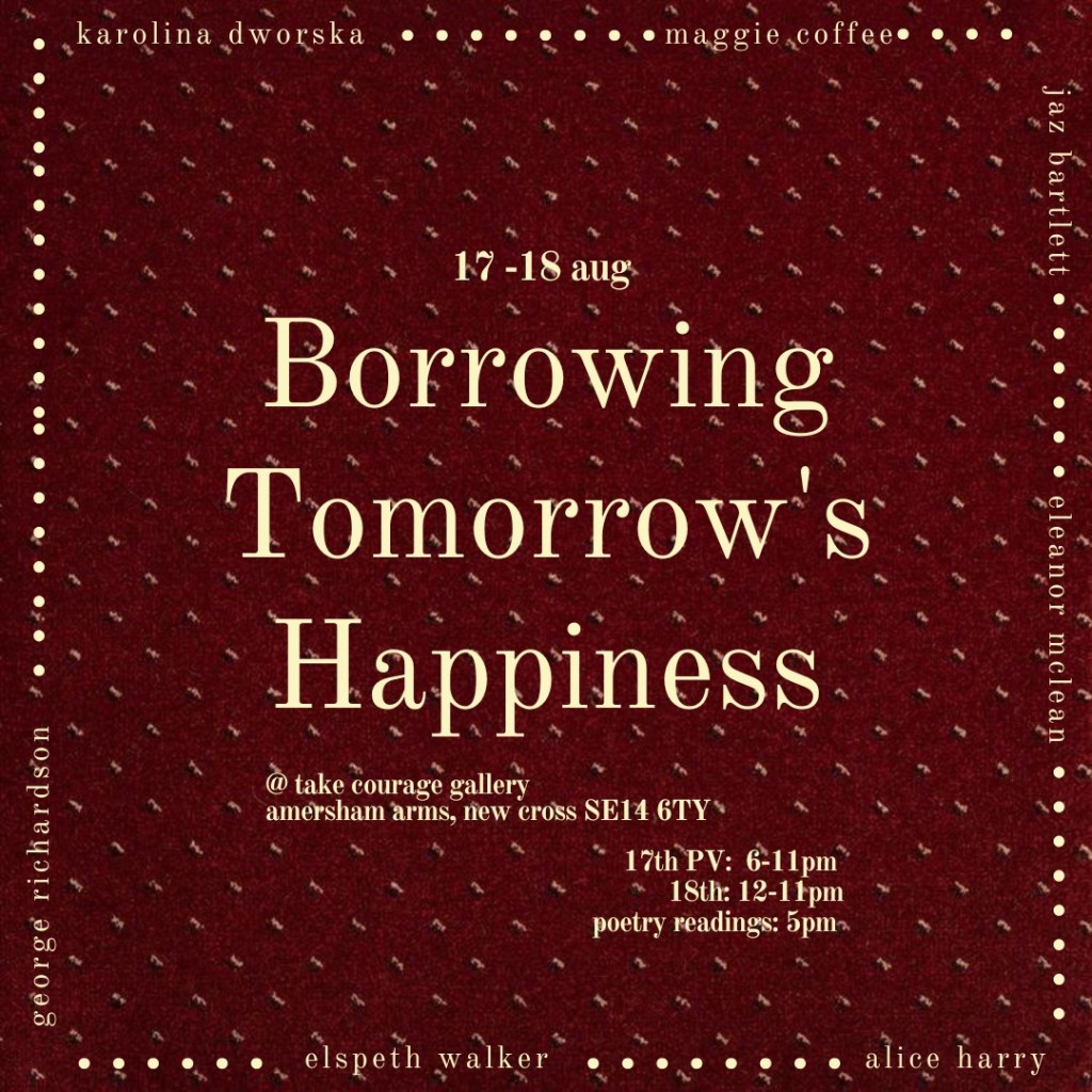 The pub can be considered a ritualistic and intimate space within culture. The show considers the pub from poetic and sculptural perspectives; a space that performs as Heterotopia [a term coined by Michel Foucault in 1967], a world within a world. It mirrors the domestic to provide a public lounge as a place to congregate, meet in social fluidity, to fall in love, a place to retreat after work, and a place that provides a shelter for the lonely. The pub poses as both a temporary freedom but also dependency in a transaction, we fall into financial fragility. The phrase to Borrow Tomorrow’s Happiness alludes to the pursuit of happiness through drinking and its consequential hangover. Happiness is presented to us as something to obtain or a promise that will come. This situates happiness as a future thought or endeavour, a desiring well.